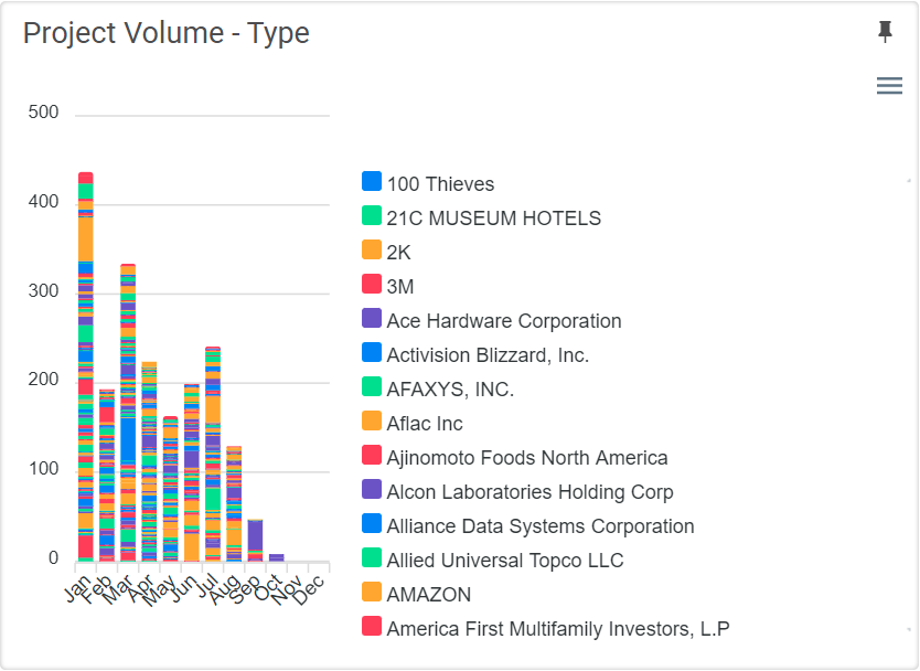 This report shows the number of projects you work on by month, client, business unit, market, etc.