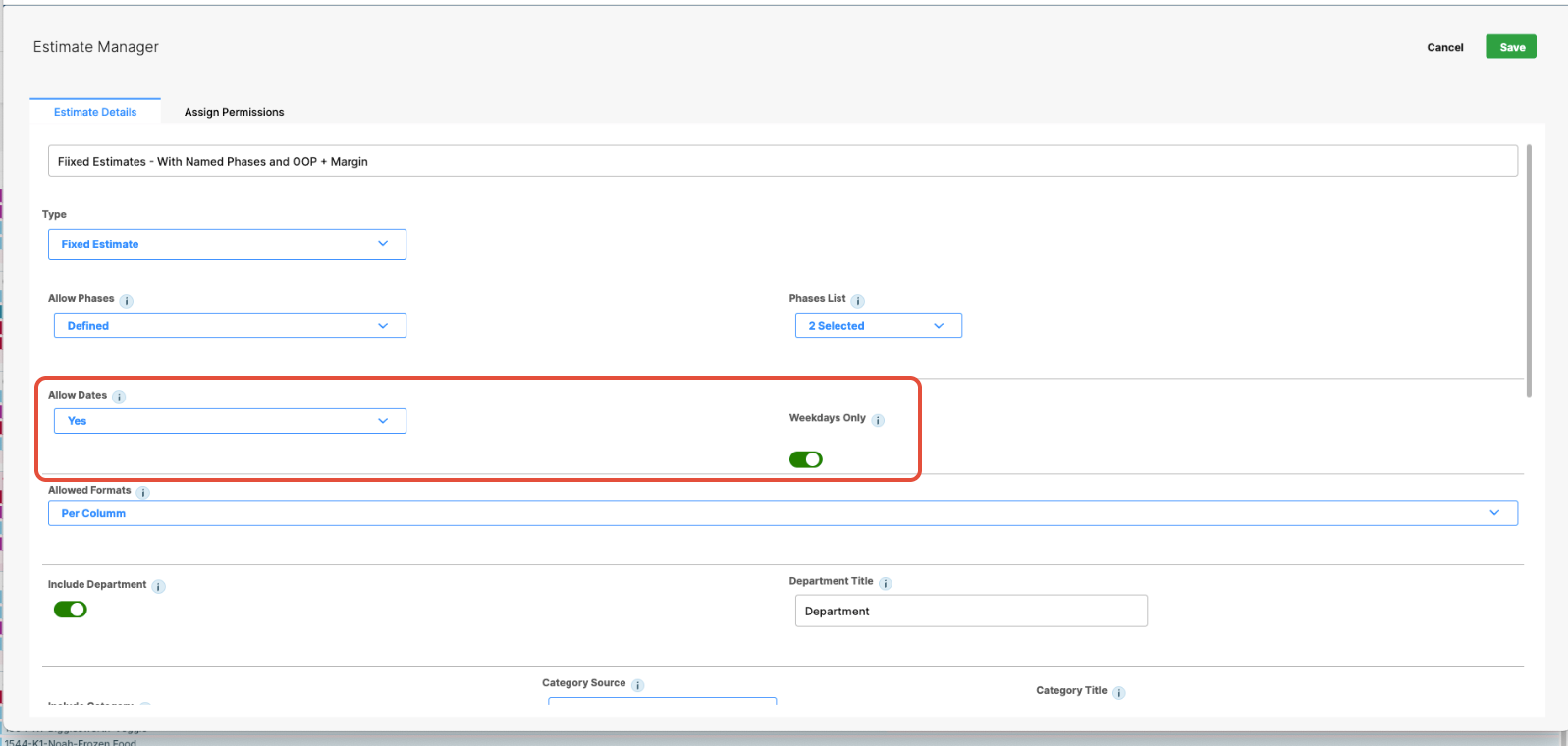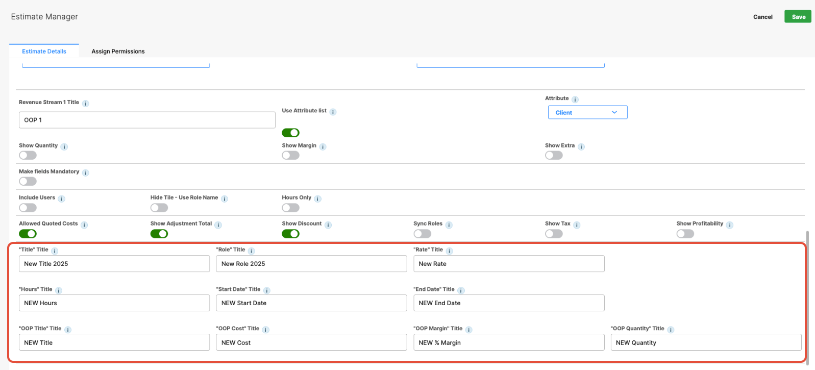 Administrators can define which fields appear in the estimate row title, such as: