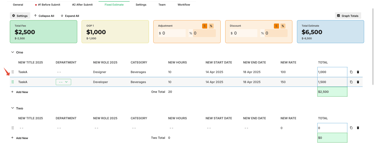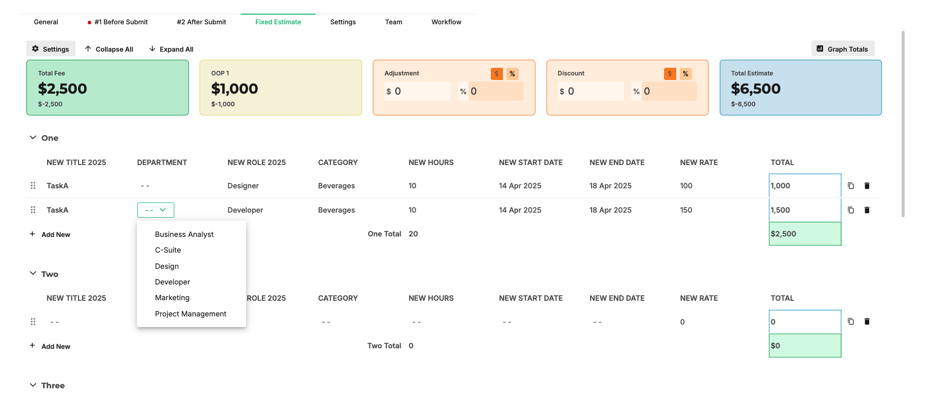 Estimate row titles can be configured based on department or category requirements.