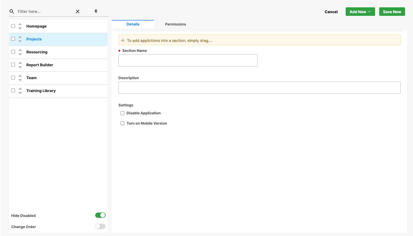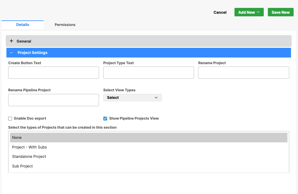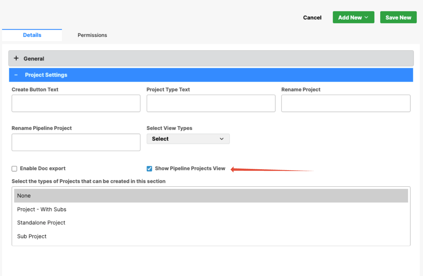 - Show Pipeline Projects View: Enables or disables the display of the Pipeline Projects View in the selected application section. It helps to determine whether users can see and access pipeline-style views (typically used for opportunity tracking, stage-based workflows, etc.). If your team doesn’t use pipeline-based project tracking, you might disable this view to streamline the interface.