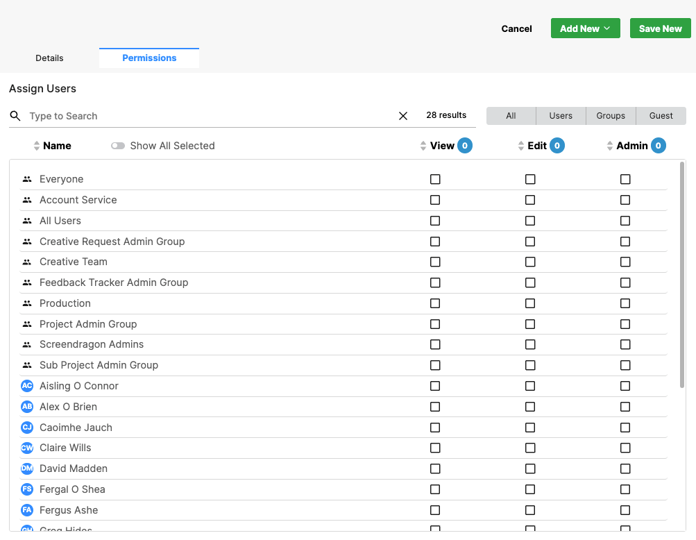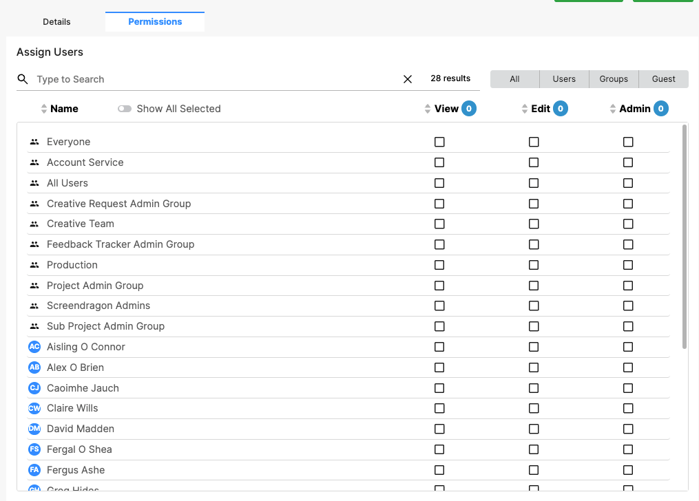 Click the Permissions tab to assign, View, Edit, or Admin permissions to individual users or groups.