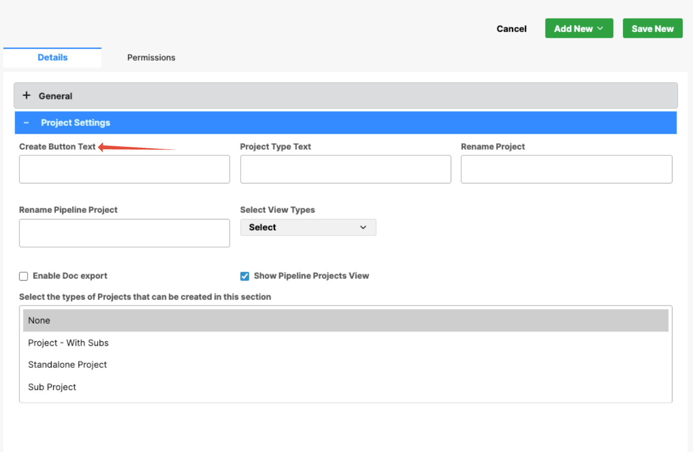 - Create Button Text: The customizable text that appears on the button used to initiate the creation of a new project. Use this to align the button label with the organization’s terminology or workflow context, enhancing clarity for users. For example, instead of the default “Create Project,” you might use “Start Campaign” or “Launch Initiative,” depending on your team's naming conventions.