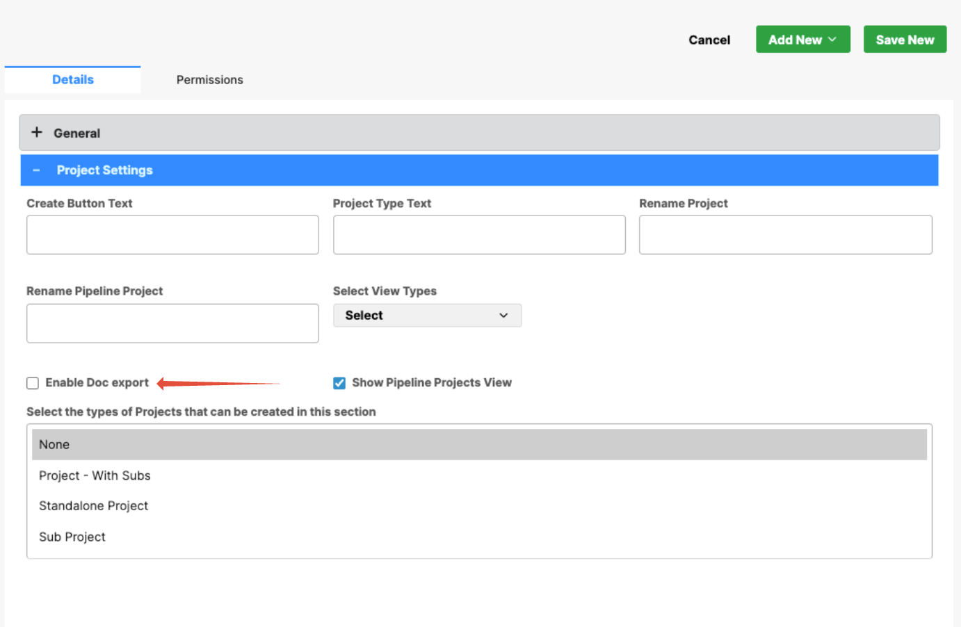 - Enable Doc Export: This toggles whether users can export project data to downloadable documents (e.g., PDF, Word). This supports reporting, sharing, or offline access by allowing users to export key project information. Enabling this might allow users to generate a project summary document for stakeholder presentations.