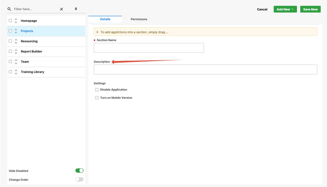- Permissions Tab: Click the Permissions tab to determine which groups or users can see the new section.