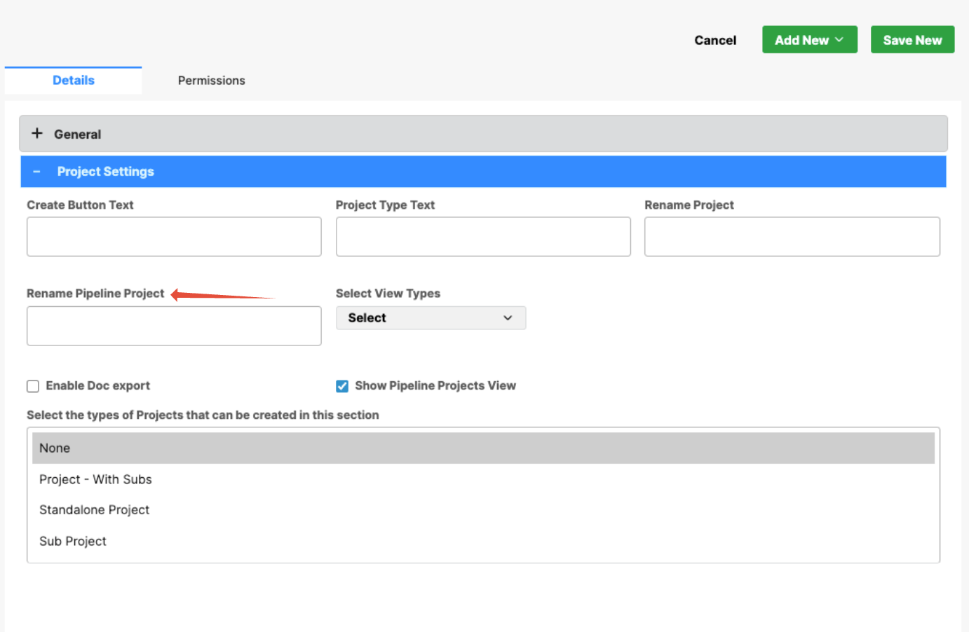 - Rename Pipeline Project: This option allows customization of the label or command used for renaming projects that are part of a pipeline workflow. Use this to match your team’s terminology and provide a clear action label for renaming pipeline-specific projects. For example, you could change it from “Rename Pipeline Project” to “Edit Opportunity Name” or “Update Stage Title,” depending on how pipeline projects are used in your organization.