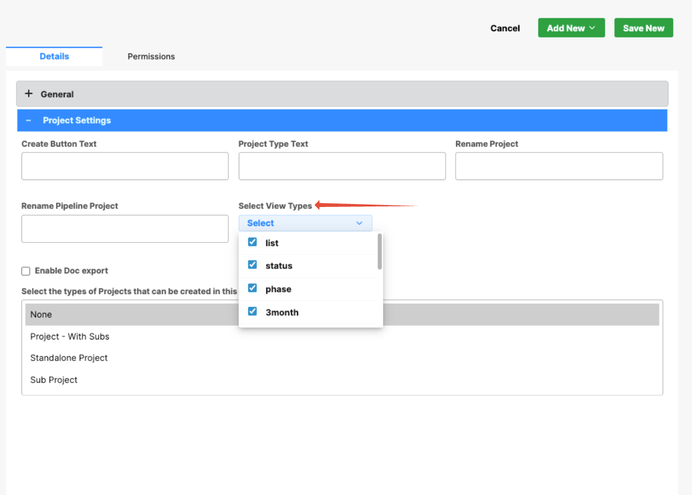 - Select View Types: This lets administrators choose which layout or interface views are available for users managing projects in this section. Use this to control the display options for section data, enabling users to work in the format that best fits their role or workflow. For example, you might enable the Kanban and List views for task tracking, but disable Gantt if it’s irrelevant to your team.