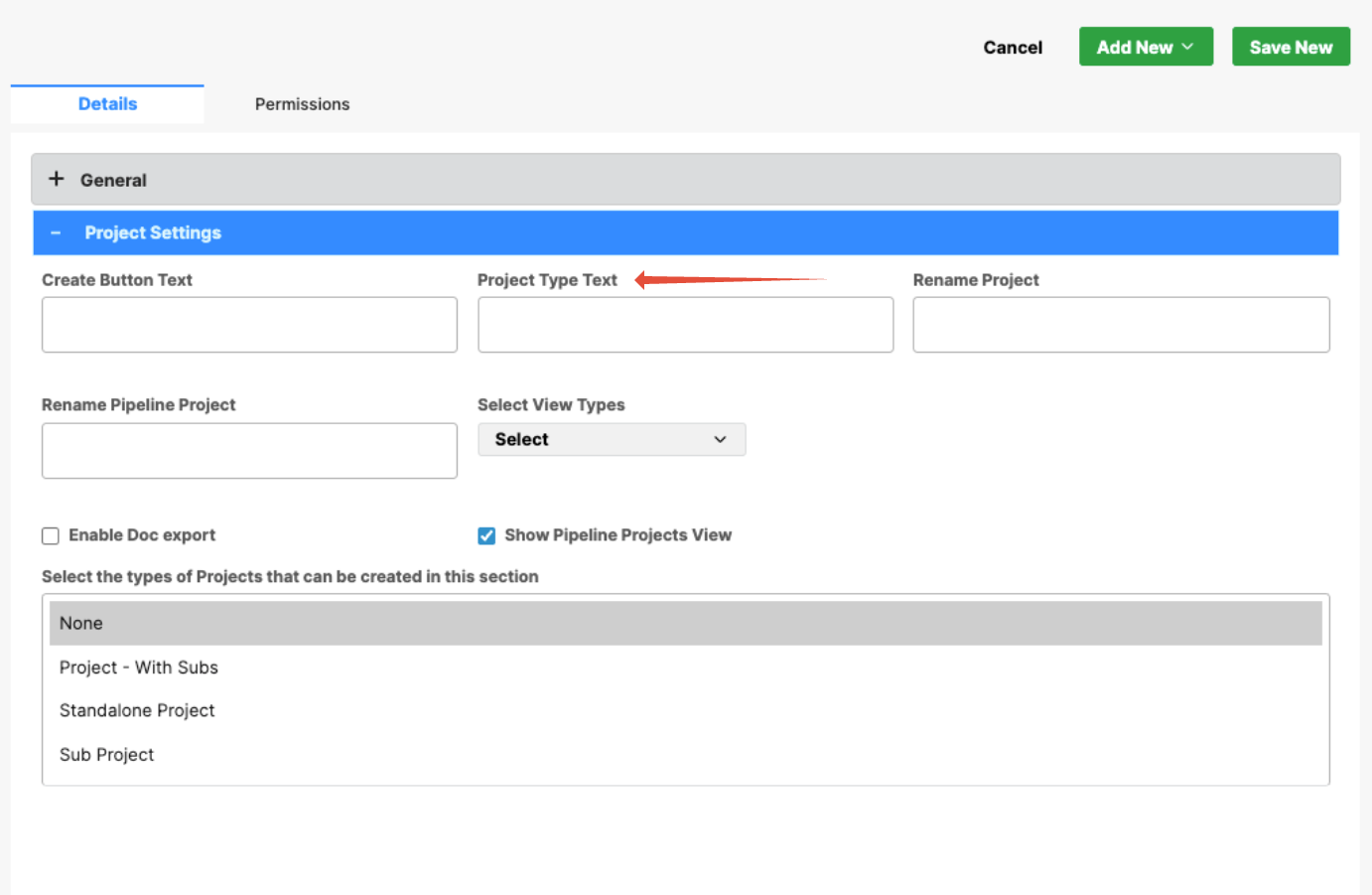- Project Type Text: The label used to identify or categorize the type of project being created or managed.Purpose: To clarify what kind of project is being selected or created, allowing customization to reflect business-specific classifications.