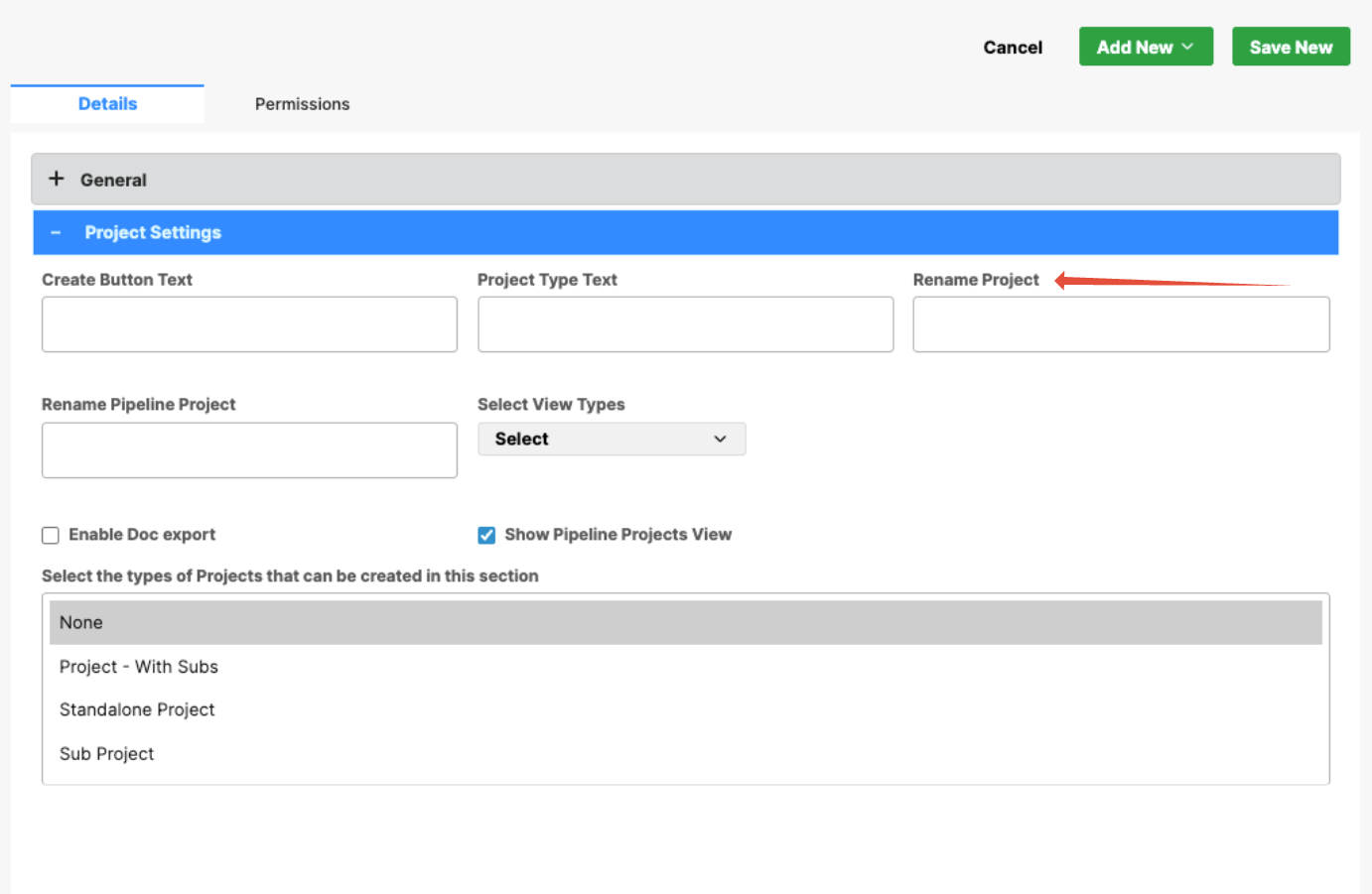 - Rename Project: This setting or label allows users to change the name of an existing project after it has been created. This allows editing the project title as project scopes evolve or naming corrections are needed. An example might be “Rename Project,” but you can change it to something like “Update Title” or “Edit Project Name” to suit your organization's tone or terminology.