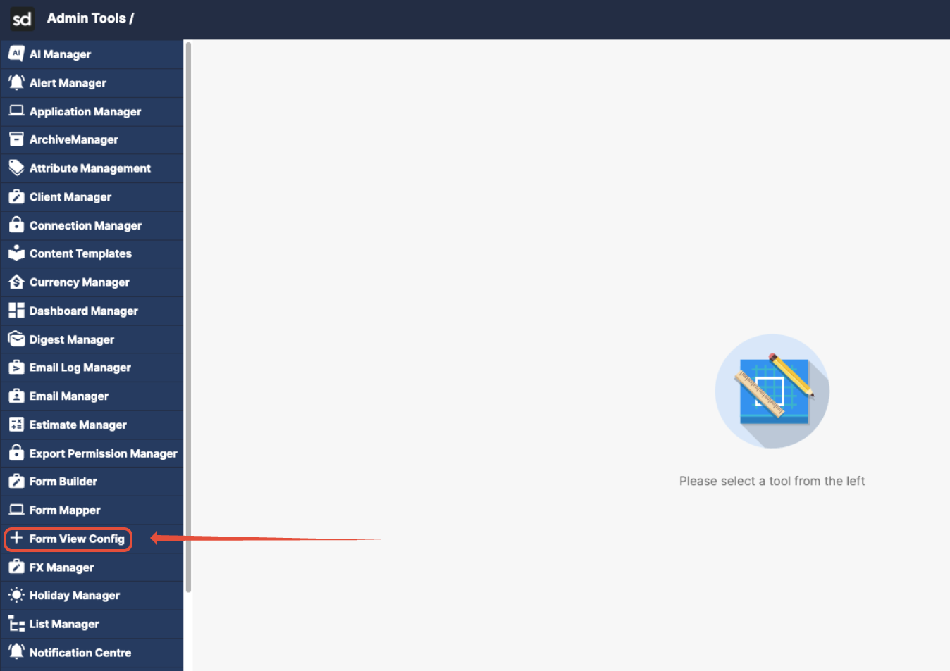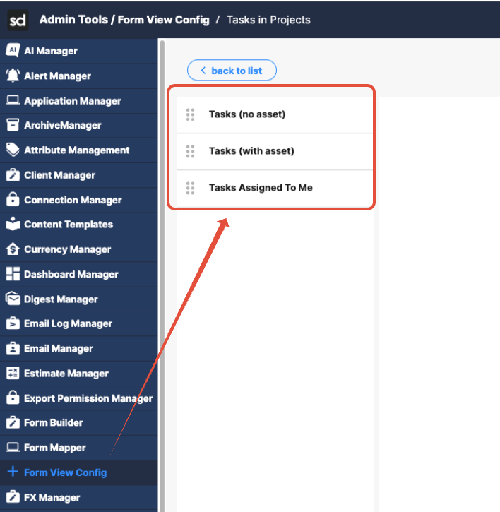 The Form View Config admin tool controls what users see when they open a list of forms on the front end. Whether a list appears within a Workflow section, as a standalone top navigation item, or within a Project section, the Form View Config determines the content returned.