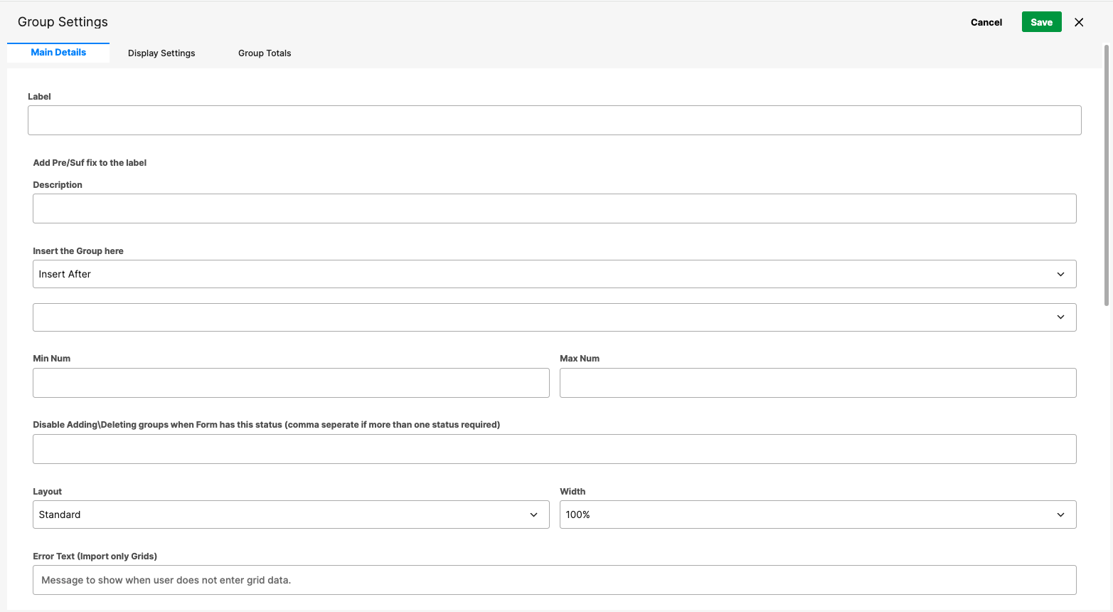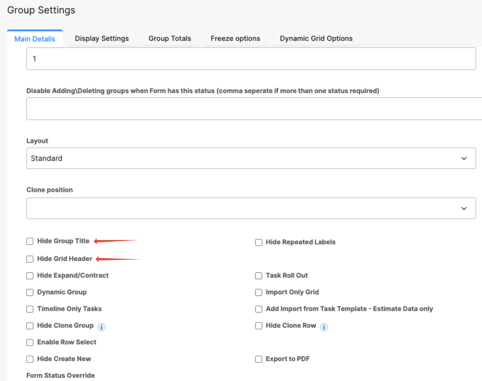 - Hide Grid Header — Hides the header row that labels each field column within the group.