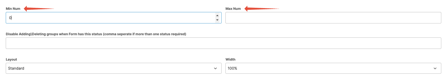 Min = 1: One row appears by default and must be completed if the fields within the group are mandatory.