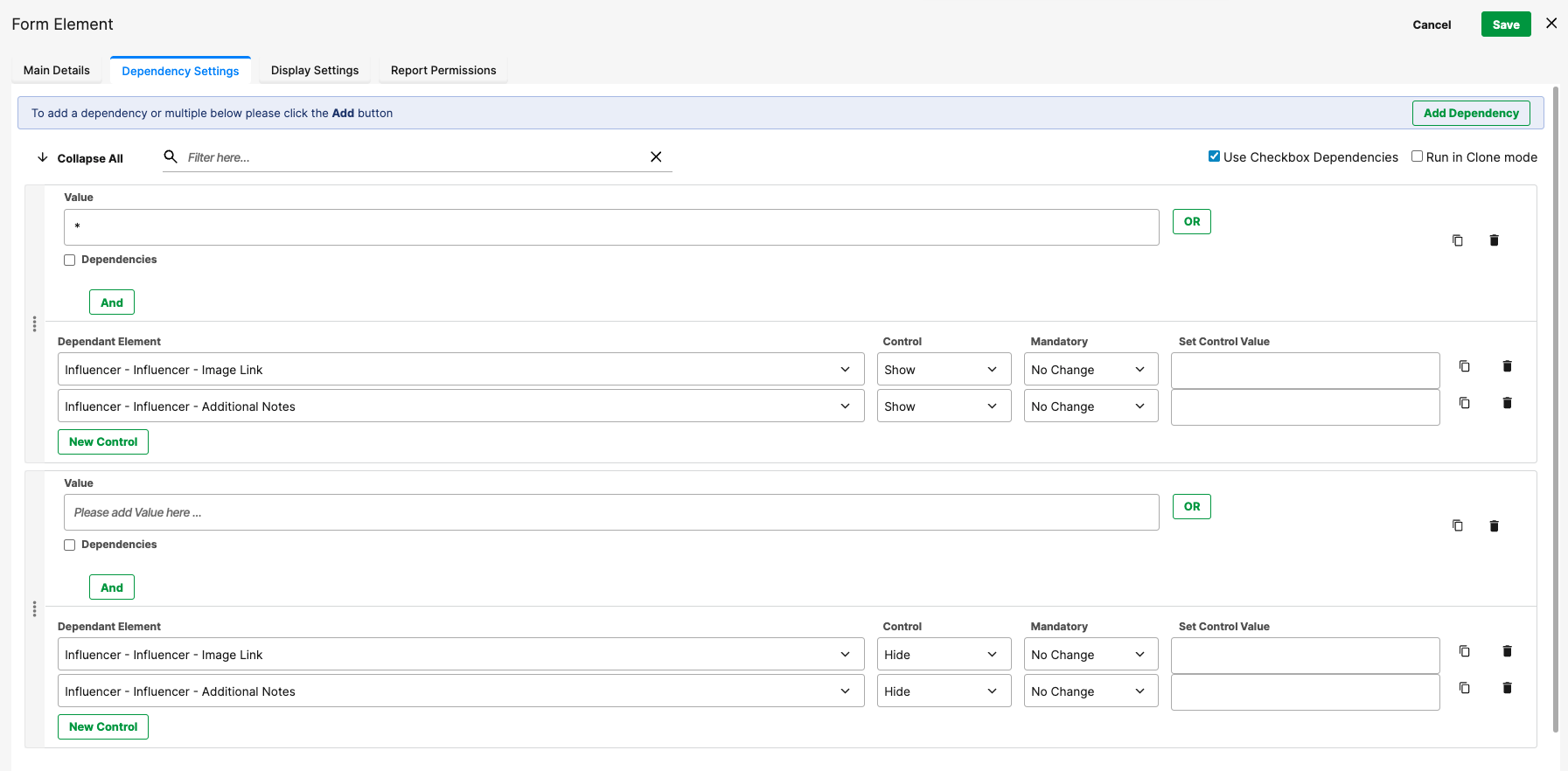 - Group-level dependencies allow you to show or hide the entire group based on conditions elsewhere in the form.