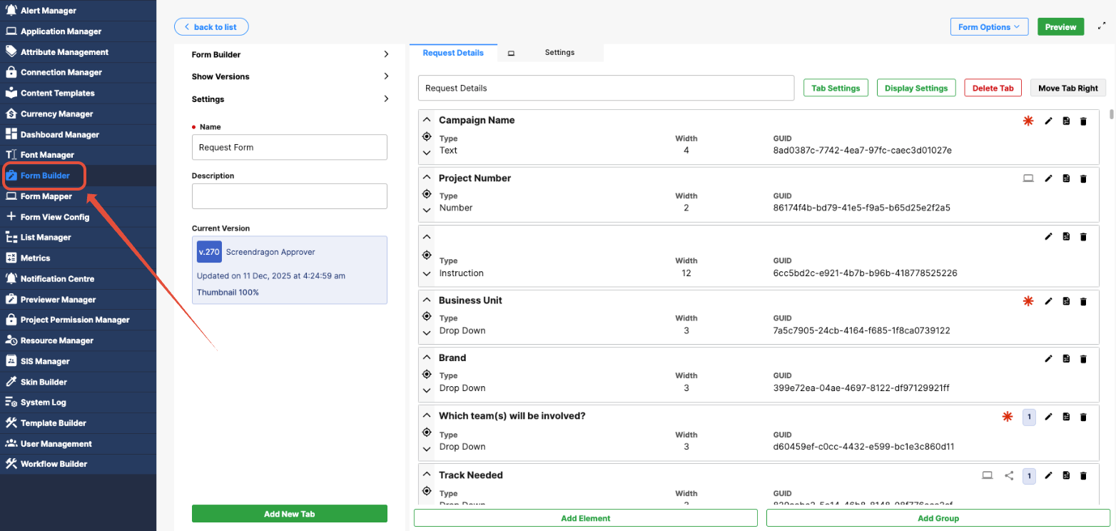 The Form Builder allows you to create and manage the forms used throughout Screendragon, including forms for Projects, Workflows, Profile Forms, and Tasks.