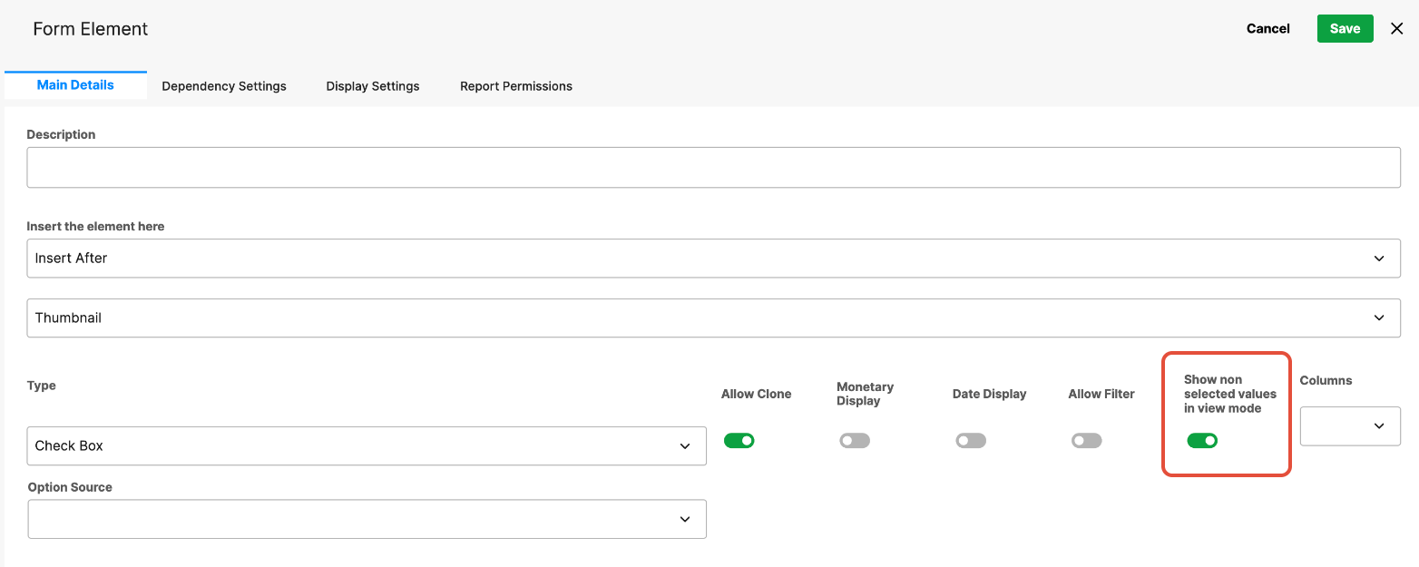 When enabled, this option displays all available values for the field in view mode, including those that were not selected. This allows users to view the full list of available options for reference and clearly indicates which values were selected.