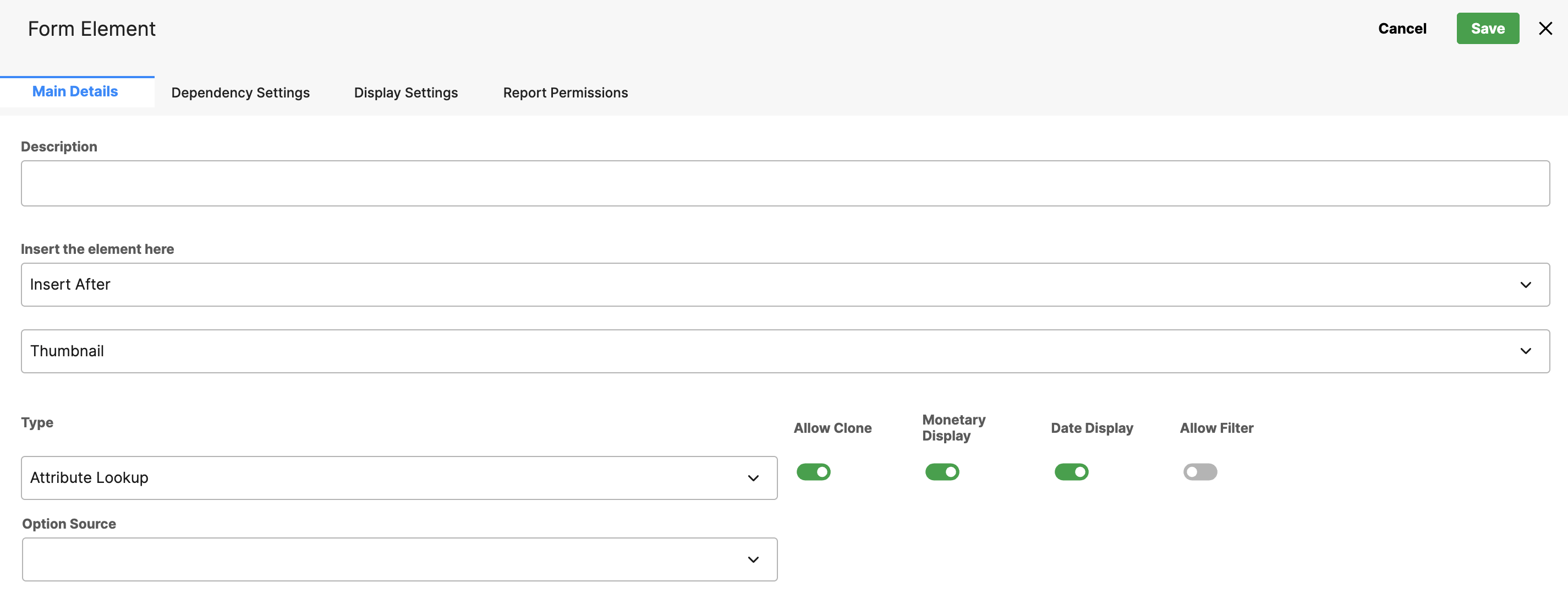 Option Source defines where the values in a drop-down field come from. Options can be sourced from a static list, another form field, system data, or an external source, keeping dropdowns consistent, dynamic, and reusable across forms. The choice determines whether other fields are required.