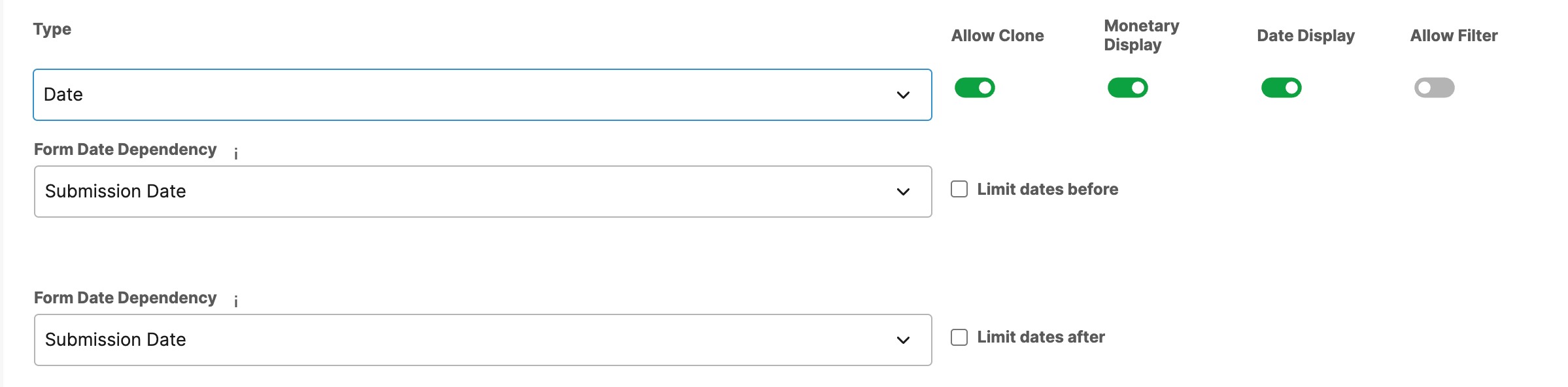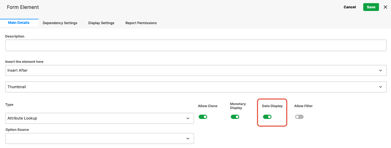 - Date Display defines how date values are presented to users, including the format and level of detail.