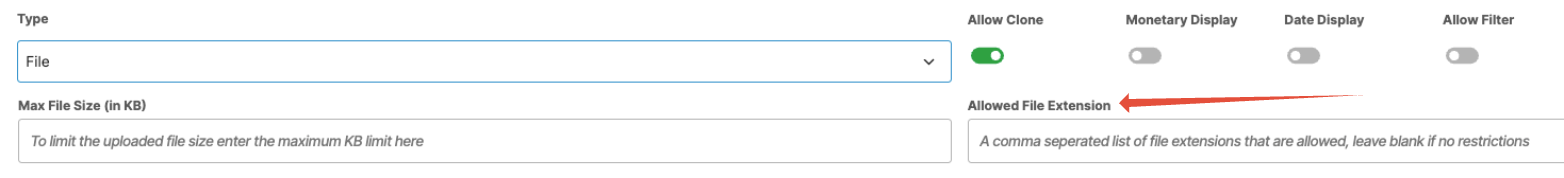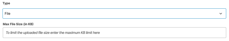 Max File Size / Allowed File Extension (File) – Define upload rules.