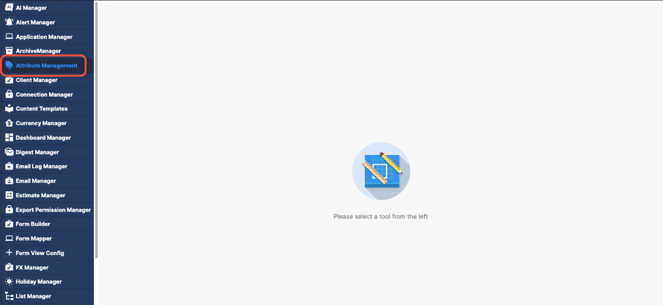 This action opens the Admin Tools page in a new browser tab. From the left-hand navigation panel, select Attribute Management to proceed.