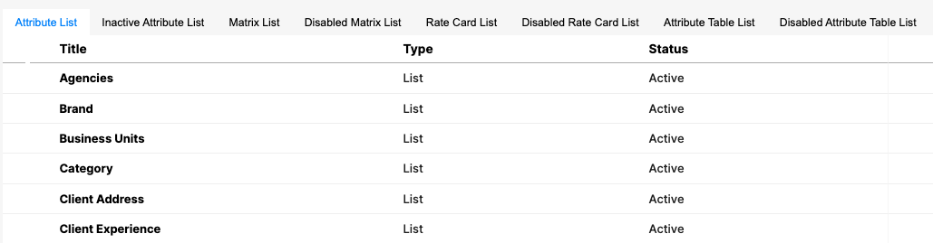 Within the Attribute Management interface, multiple tabs are available—each representing a distinct category or type of attribute data utilized throughout the system.