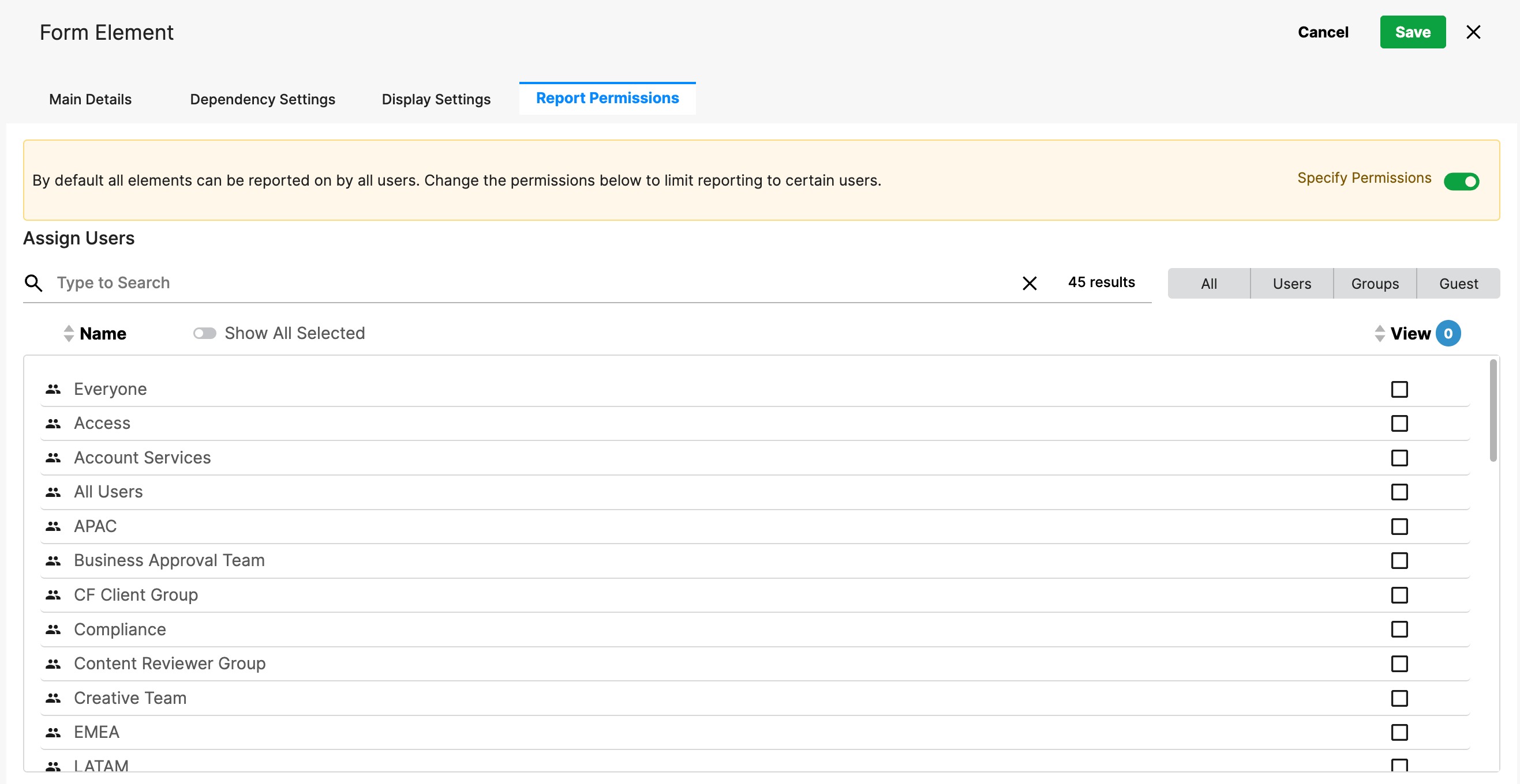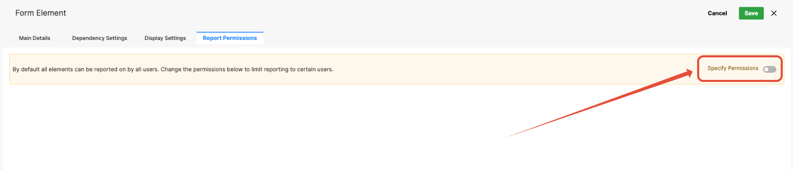 By default, all elements are visible to all users. Use the Specify Permissionsdisplay settings below to control visibility based on the user or context.