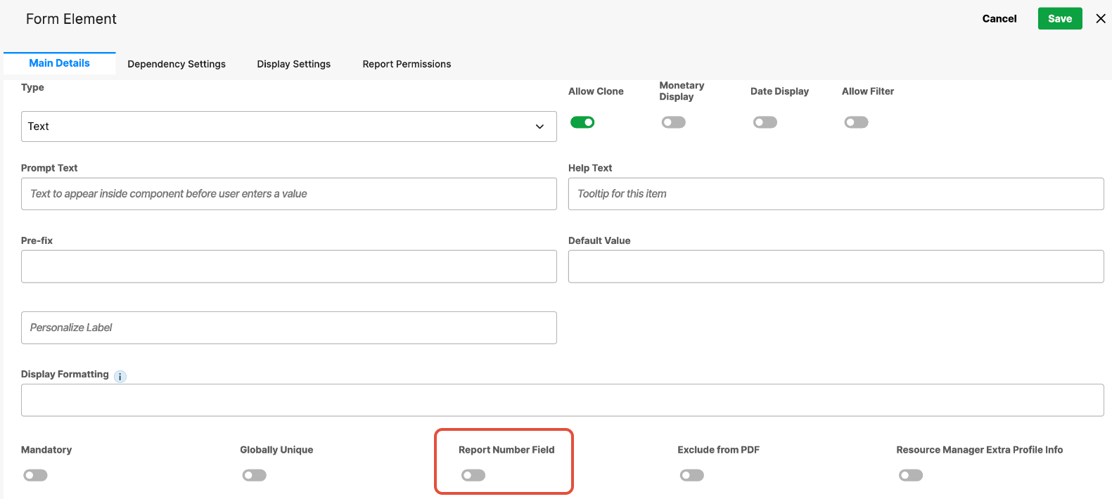 - Report Number Field – When enabled, treats the field as a numeric value for reporting, allowing it to be used in calculations, sorting, and numeric reports.