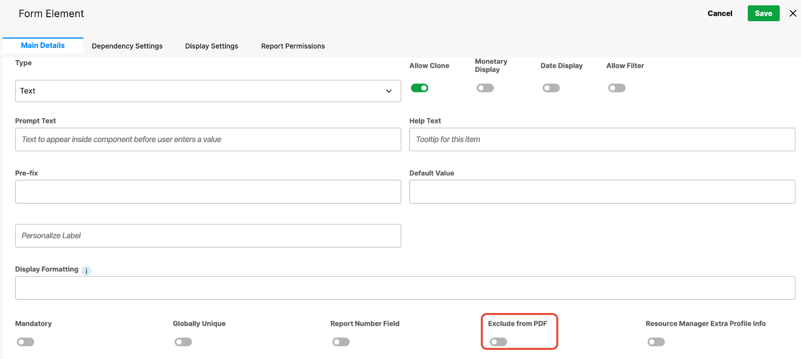 - Exclude from PDF – When enabled, the field will be omitted from generated PDF outputs, even though it remains visible in the form.