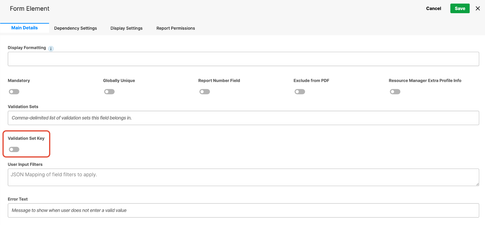 - Validation Set Key – When enabled, marks the field as the key used to identify and apply the selected validation set.