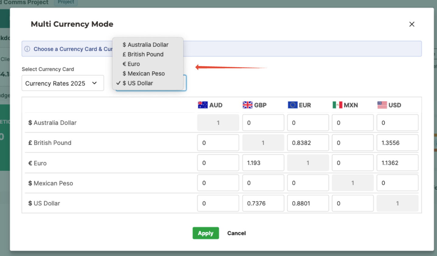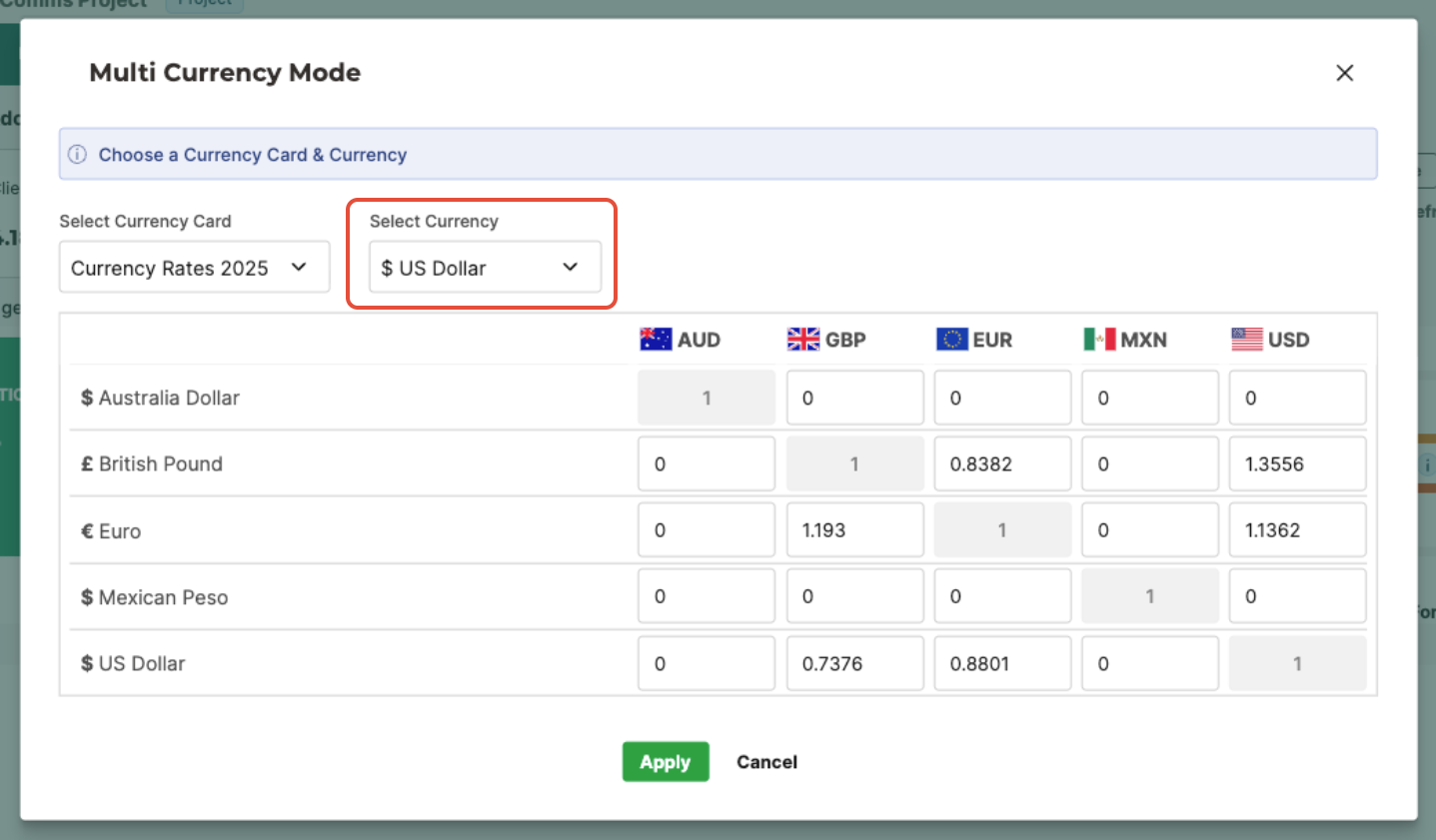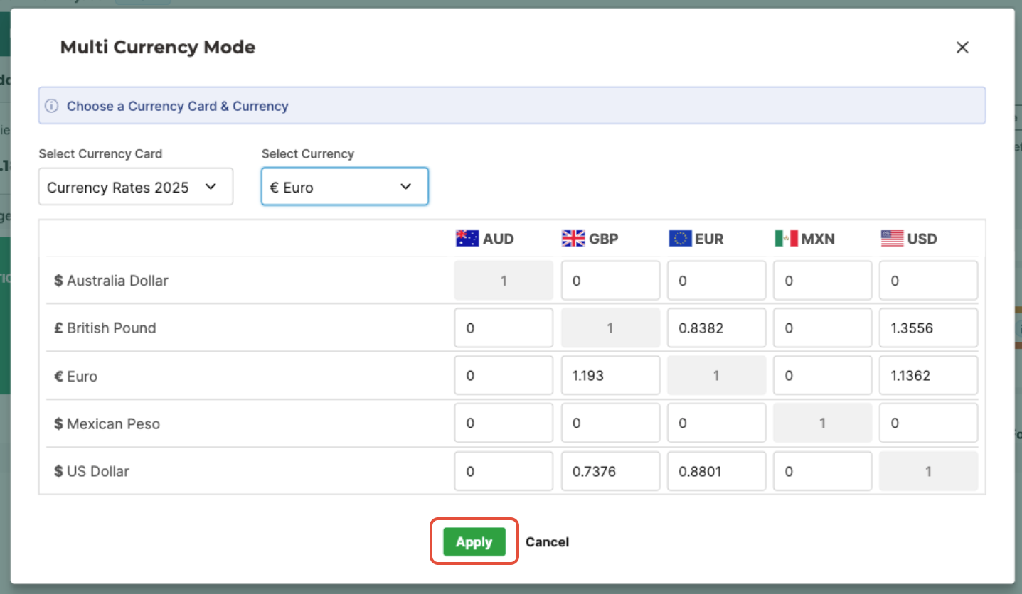 - Click Apply FX Rate to open the Multi Currency Mode dialog box.
